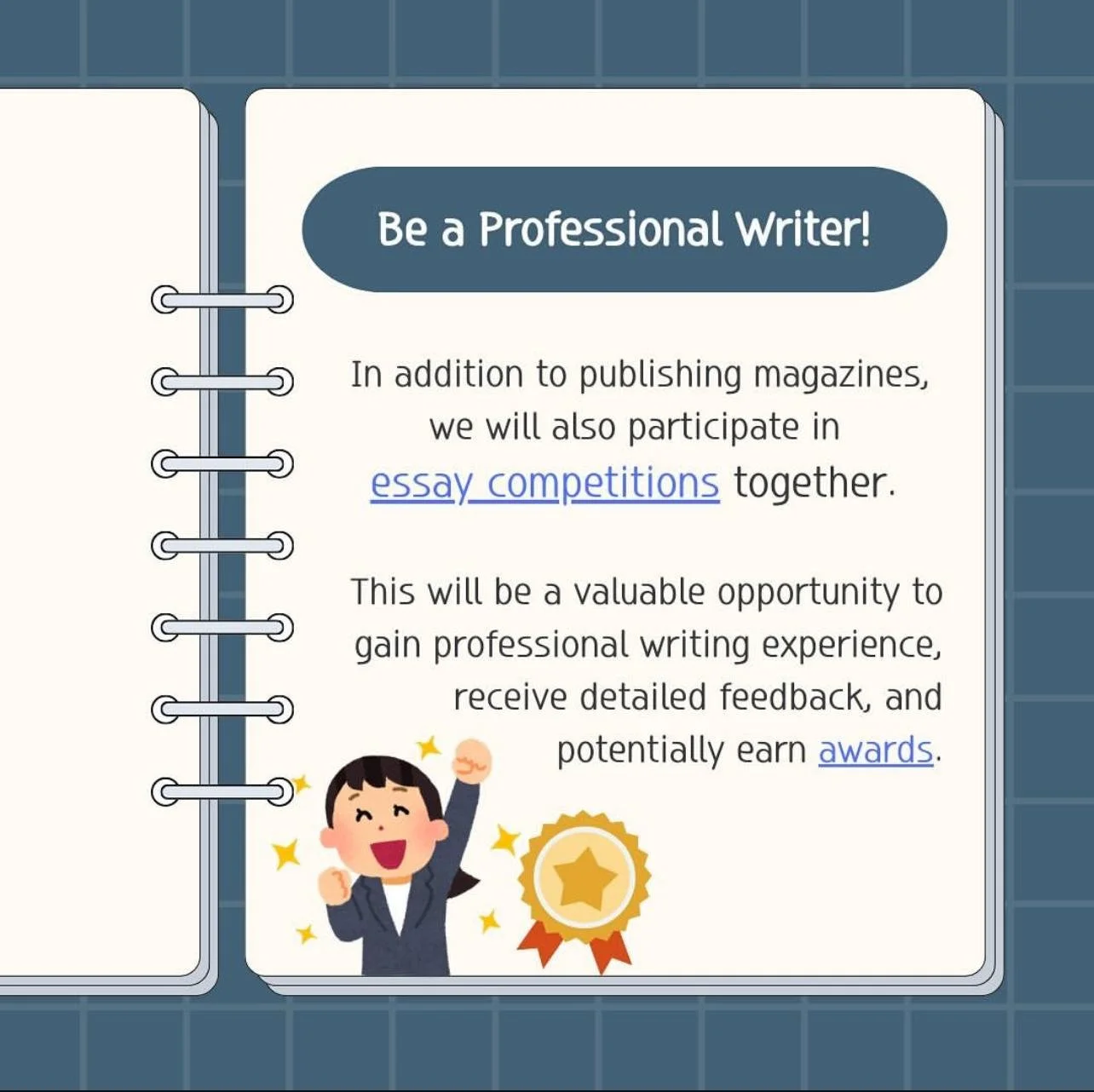 I led the school publication club with the goal of nurturing creativity and improving students’ writing and journalism skills. Throughout the year, our team published over 10 pieces in the school magazine and newspaper, highlighting student voices and school life. Beyond editing and publishing, I managed the club’s operations, guided members through the writing process, and launched a tutoring program to help younger students develop their writing. What started as a small initiative within the club eventually grew to include middle and elementary school students, creating a community connected through storytelling and expression.